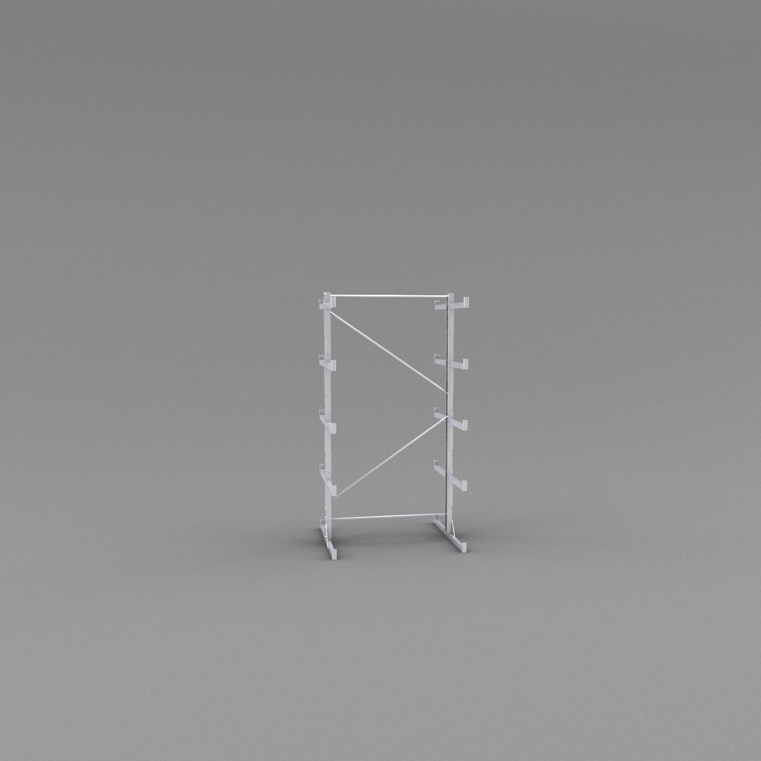 När det gäller säkerheten är inget lämnat åt slumpen i den här hyllan. Den är byggd i galvaniserat stål för att motstå slitage och rost och de kraftiga fötterna i botten kan samtidigt användas som bärlag. På varje gren sitter ändstopp på 5 cm för att undvika att godset faller ner och i stammen sitter korsstag som håller ihop kolonnerna och ger maximal stabilitet.