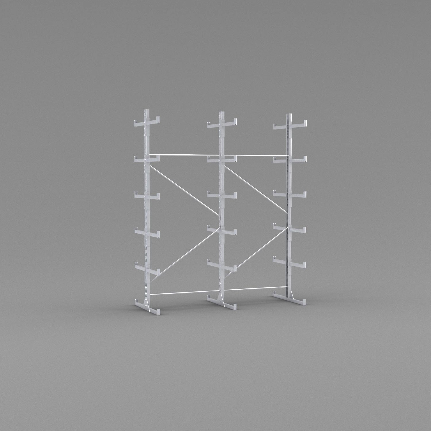 När det gäller säkerheten är inget lämnat åt slumpen i den här hyllan. Den är byggd i galvaniserat stål för att motstå slitage och rost och de kraftiga fötterna i botten kan samtidigt användas som bärlag. På varje gren sitter ändstopp på 5 cm för att undvika att godset faller ner och i stammen sitter korsstag som håller ihop kolonnerna och ger maximal stabilitet.