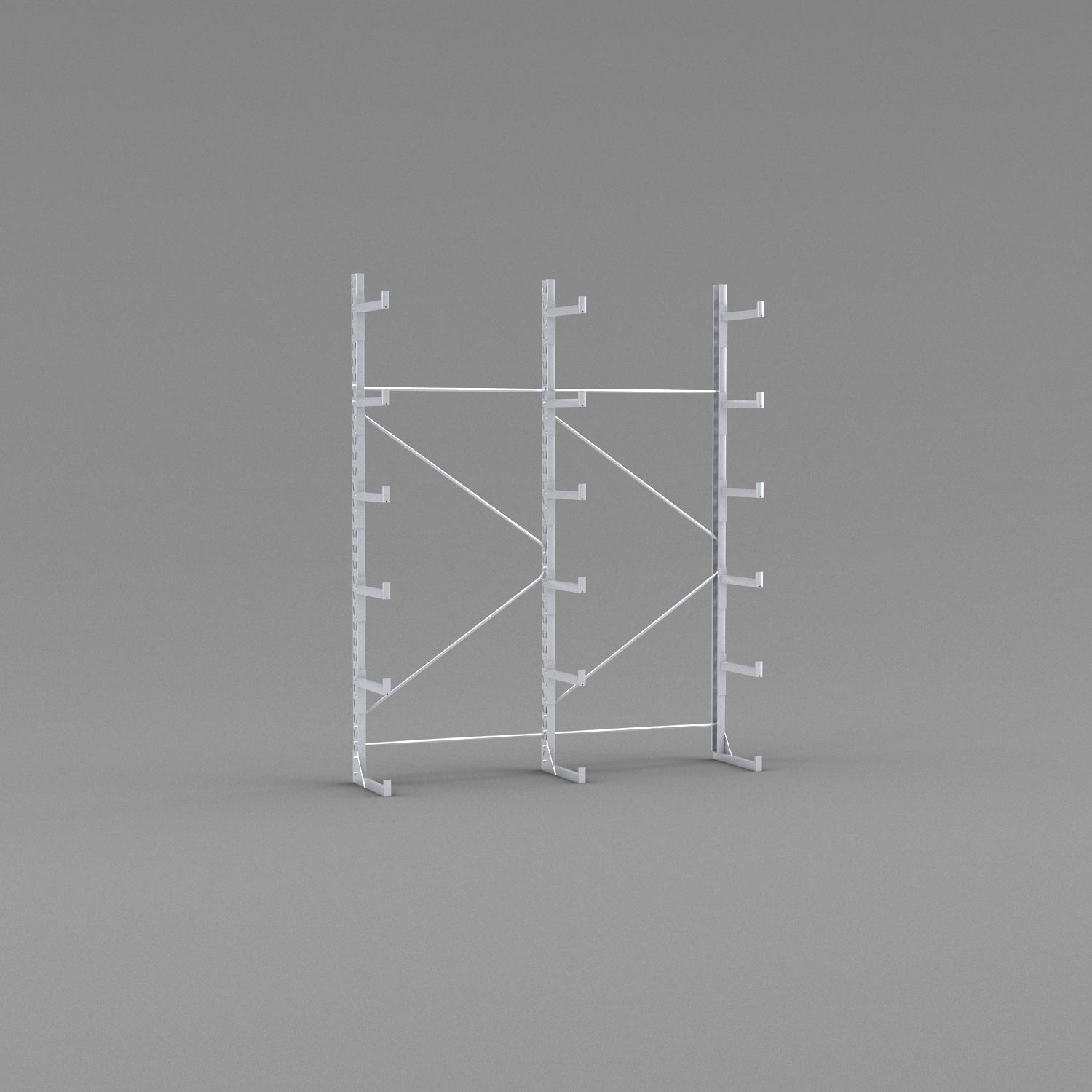 När det gäller säkerheten är inget lämnat åt slumpen i den här hyllan. Den är byggd i galvaniserat stål för att motstå slitage och rost och de kraftiga fötterna i botten kan samtidigt användas som bärlag. På varje gren sitter ändstopp på 5 cm för att undvika att godset faller ner och i stammen sitter korsstag som håller ihop kolonnerna och ger maximal stabilitet.