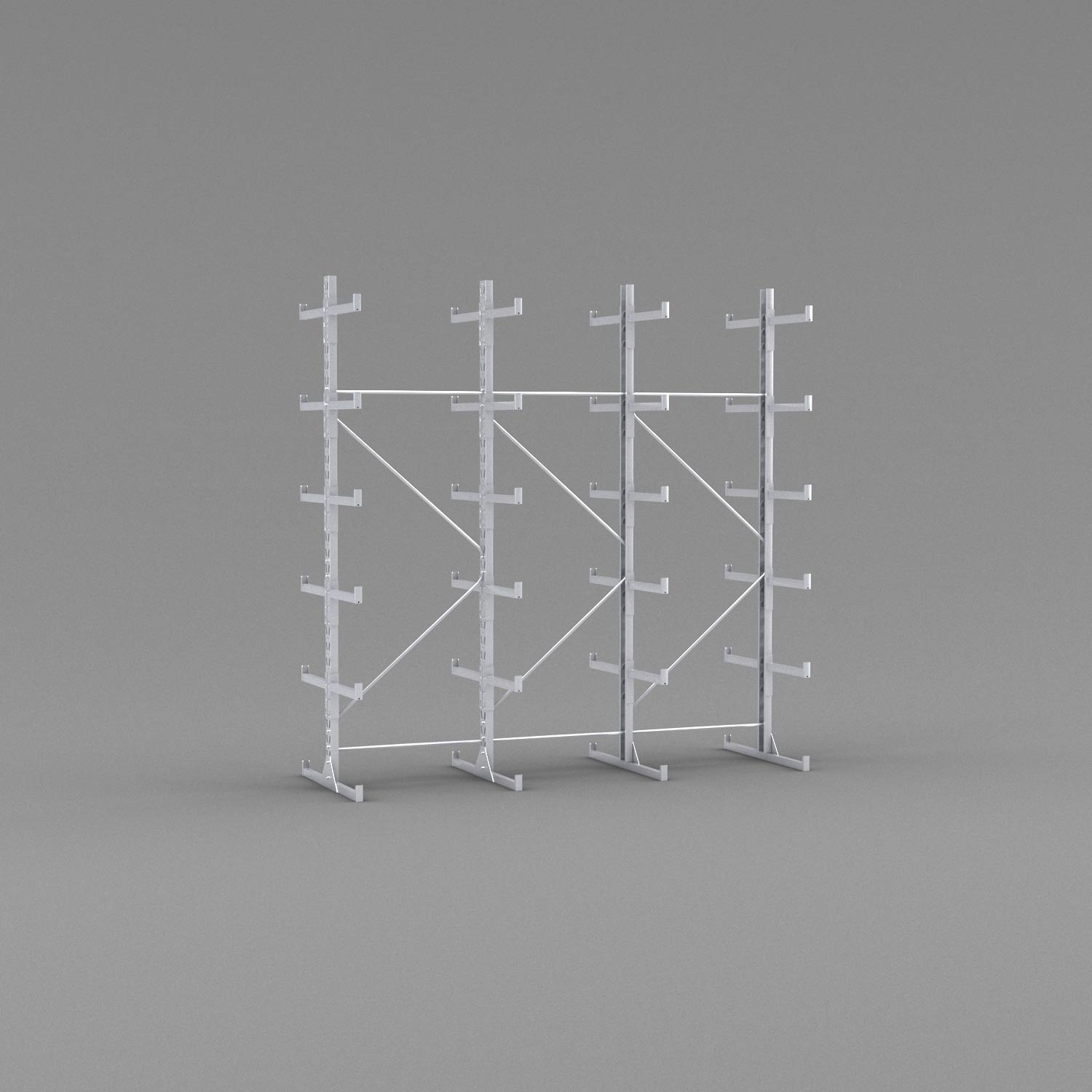 När det gäller säkerheten är inget lämnat åt slumpen i den här hyllan. Den är byggd i galvaniserat stål för att motstå slitage och rost och de kraftiga fötterna i botten kan samtidigt användas som bärlag. På varje gren sitter ändstopp på 5 cm för att undvika att godset faller ner och i stammen sitter korsstag som håller ihop kolonnerna och ger maximal stabilitet.