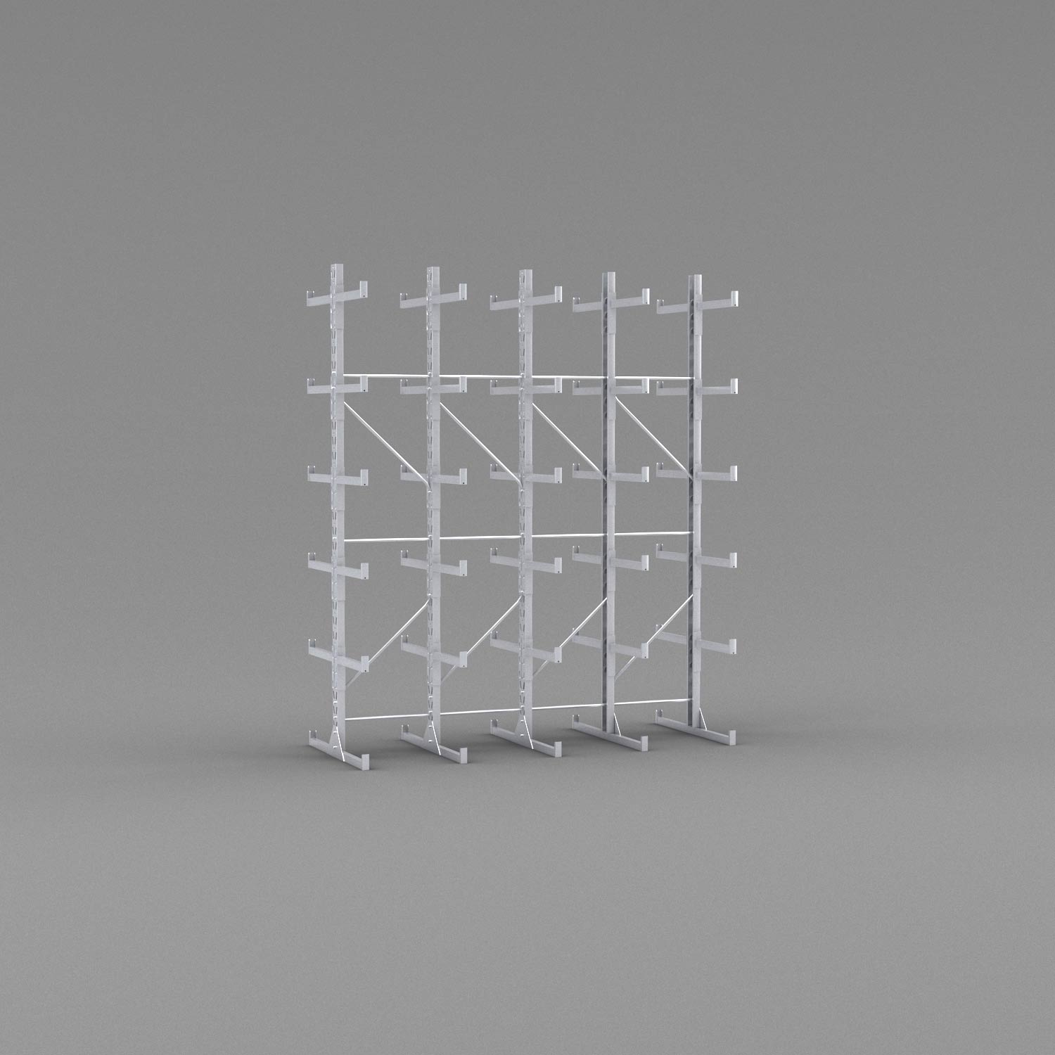 När det gäller säkerheten är inget lämnat åt slumpen i den här hyllan. Den är byggd i galvaniserat stål för att motstå slitage och rost och de kraftiga fötterna i botten kan samtidigt användas som bärlag. På varje gren sitter ändstopp på 5 cm för att undvika att godset faller ner och i stammen sitter korsstag som håller ihop kolonnerna och ger maximal stabilitet.