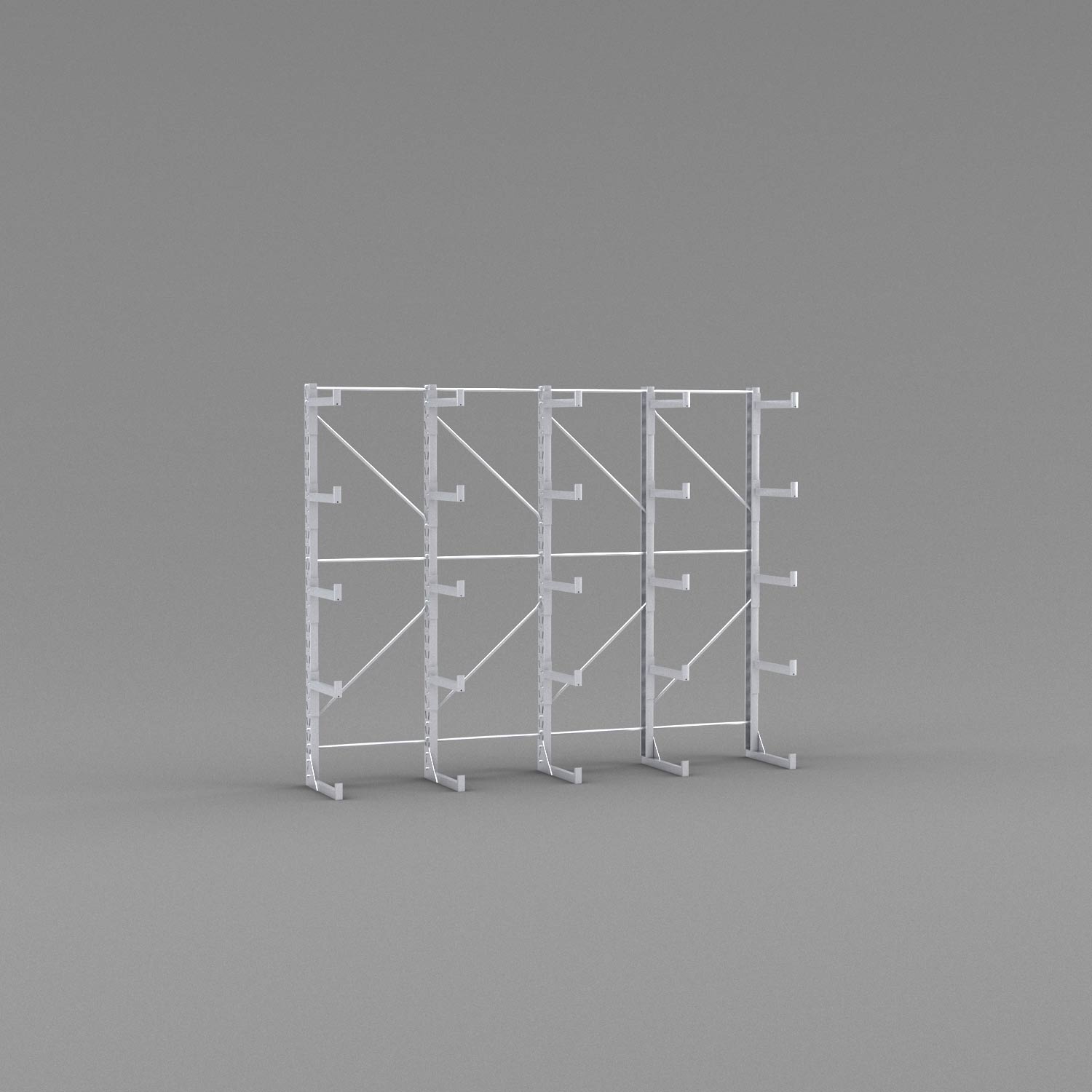 När det gäller säkerheten är inget lämnat åt slumpen i den här hyllan. Den är byggd i galvaniserat stål för att motstå slitage och rost och de kraftiga fötterna i botten kan samtidigt användas som bärlag. På varje gren sitter ändstopp på 5 cm för att undvika att godset faller ner och i stammen sitter korsstag som håller ihop kolonnerna och ger maximal stabilitet.