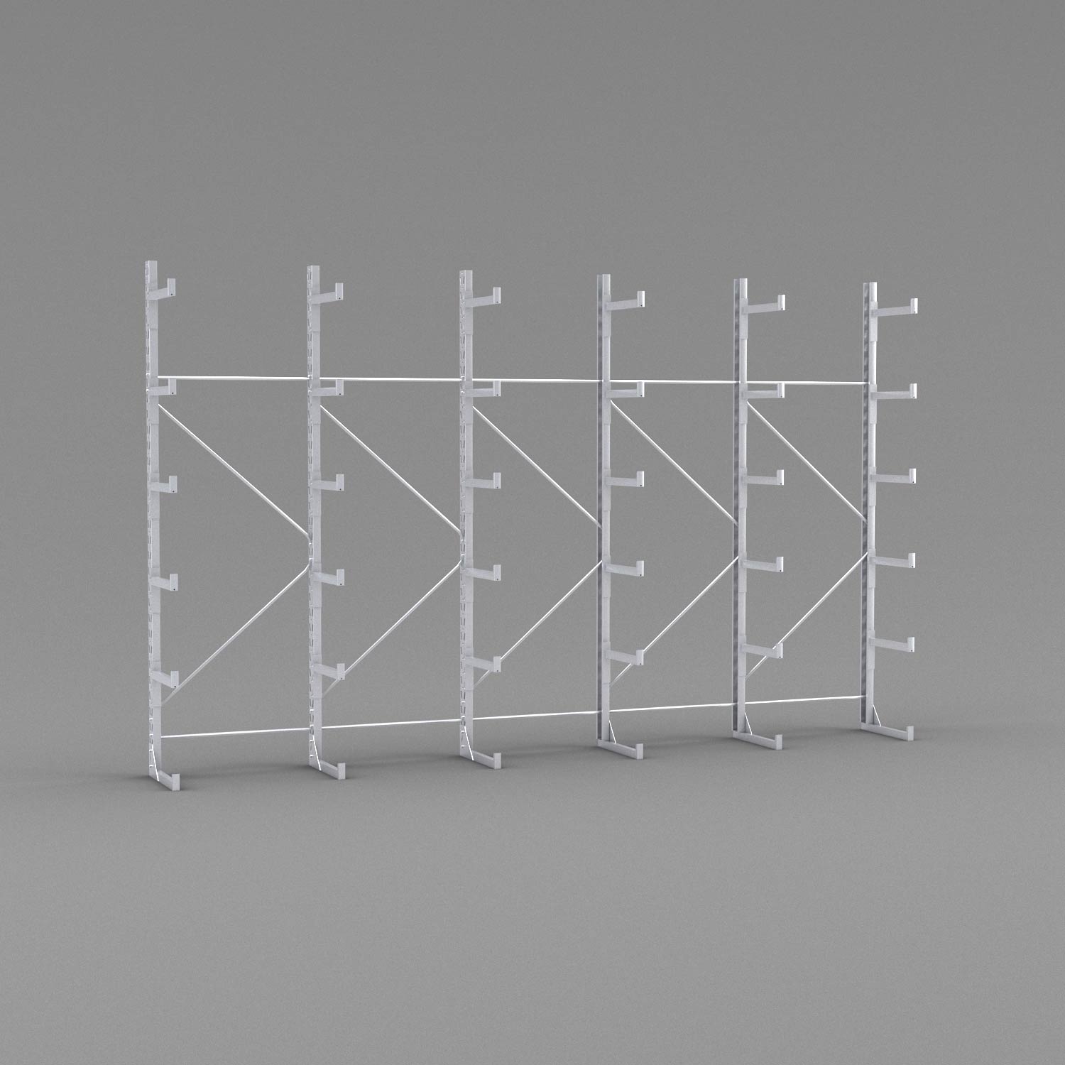 När det gäller säkerheten är inget lämnat åt slumpen i den här hyllan. Den är byggd i galvaniserat stål för att motstå slitage och rost och de kraftiga fötterna i botten kan samtidigt användas som bärlag. På varje gren sitter ändstopp på 5 cm för att undvika att godset faller ner och i stammen sitter korsstag som håller ihop kolonnerna och ger maximal stabilitet.