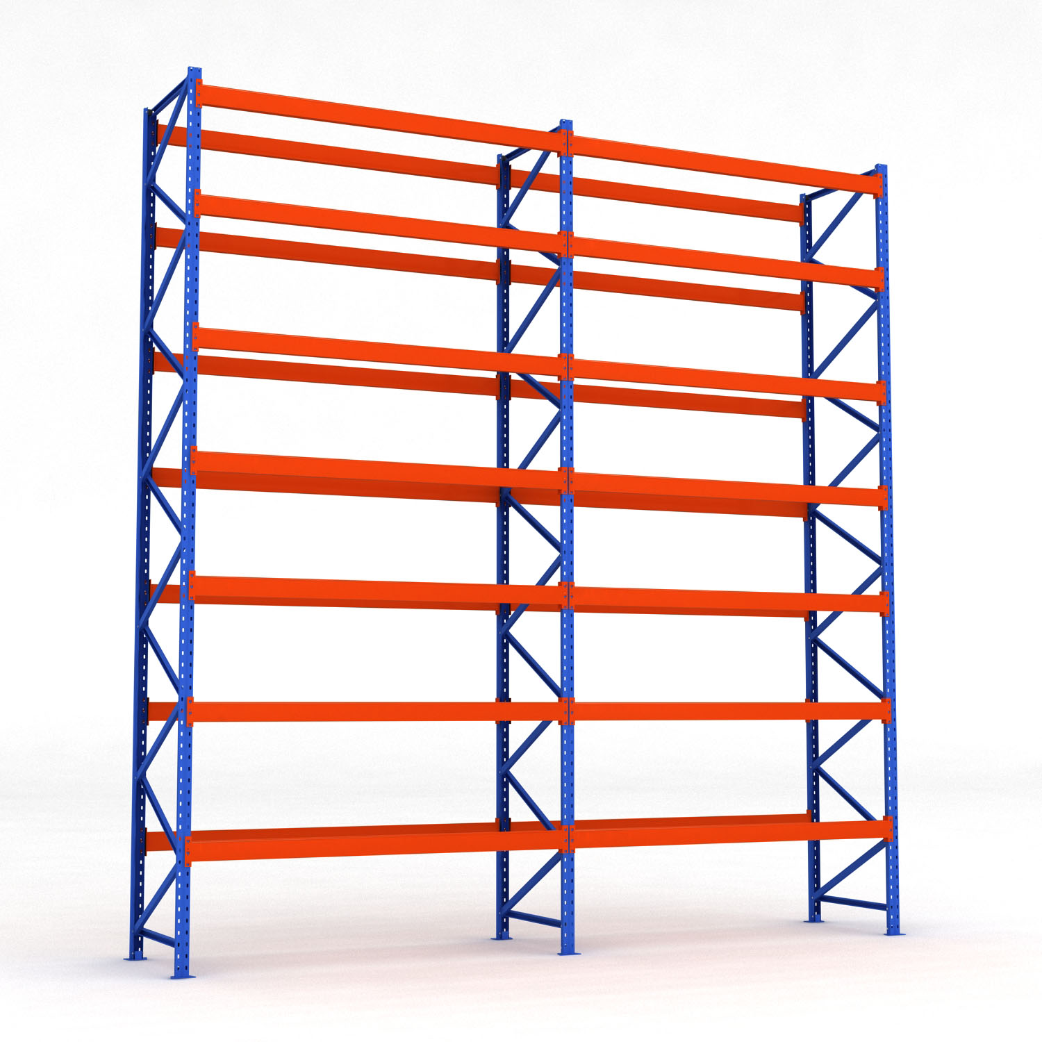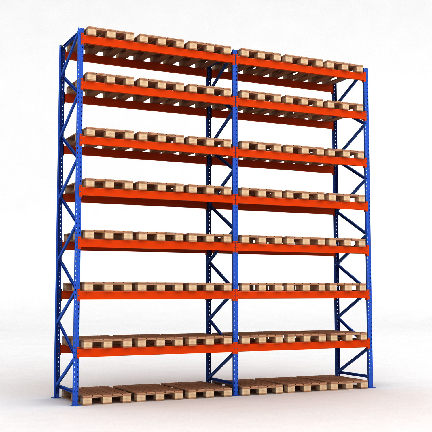 Våra pallställ är tillverkade i kraftigt pullverlackat stål och är designade för att klara av extremt hög belastning. Pallställen har en bärkraft på 3 ton per bärplan och en maxbelastning per pallställ på 20 ton. Detta pallställ består av 2 fack med totalt 48 euro-pallplatser.