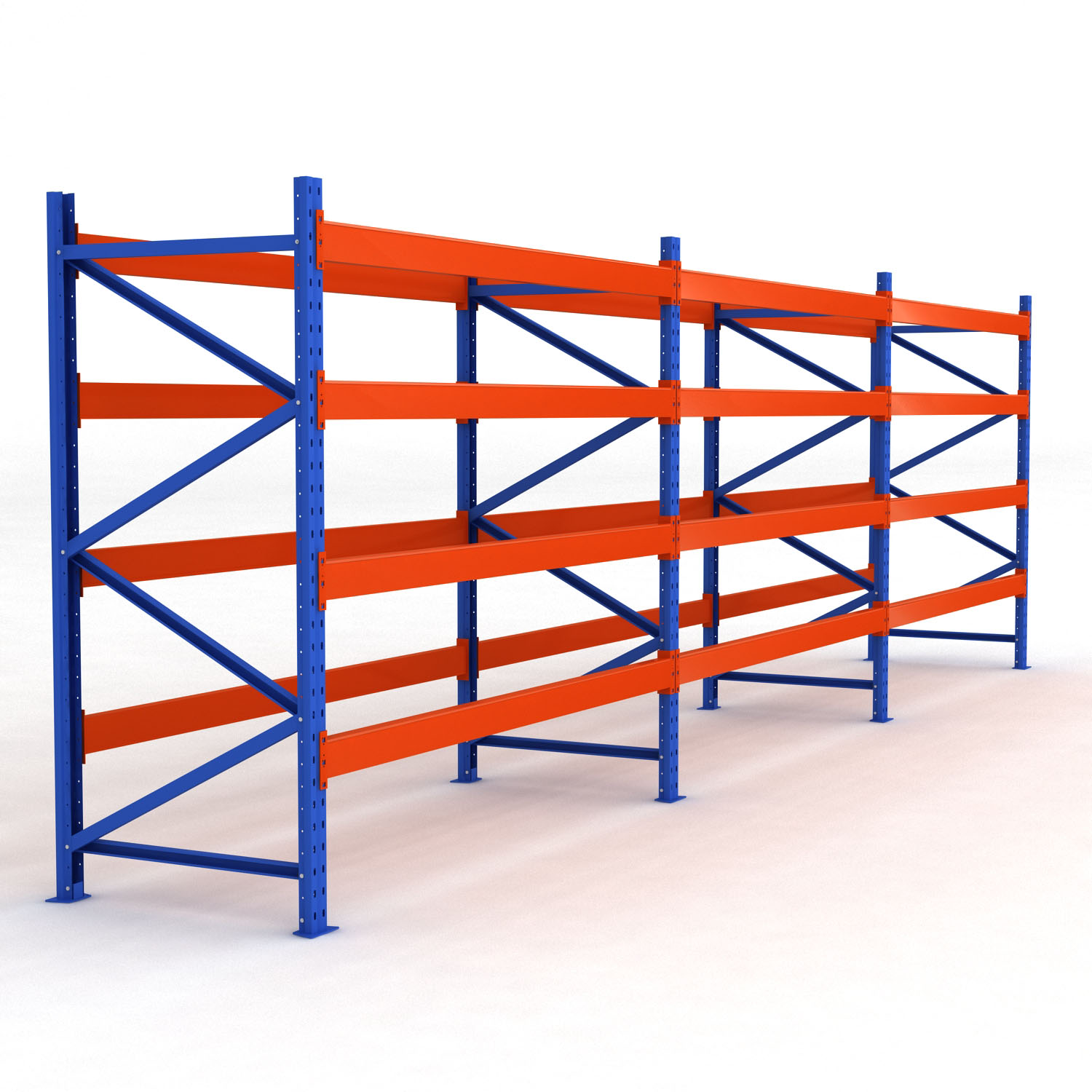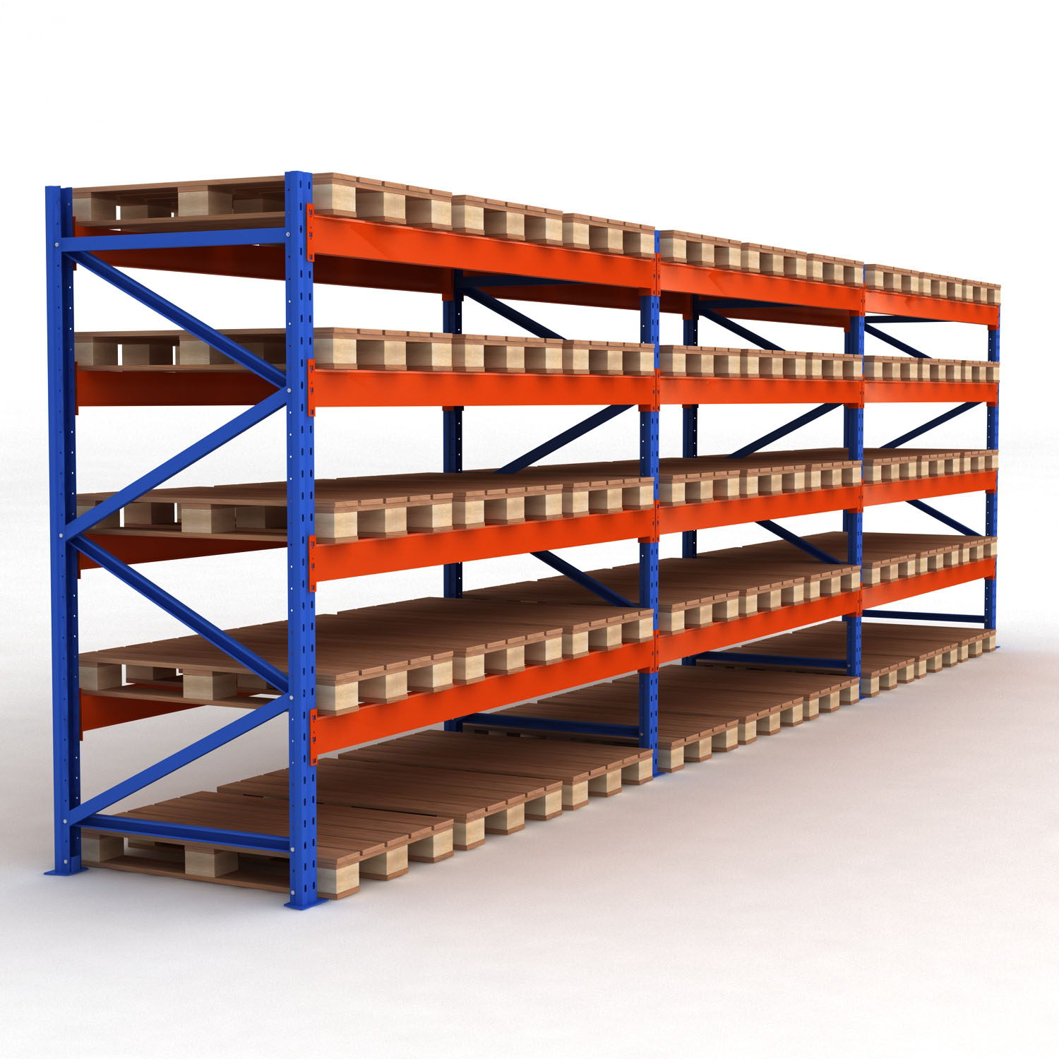 Våra pallställ är tillverkade i kraftigt pullverlackat stål och är designade för att klara av extremt hög belastning. Pallställen har en bärkraft på 3 ton per bärplan och en maxbelastning per pallställ på 8 ton. Detta pallställ består av 3 fack med totalt 45 euro-pallplatser.