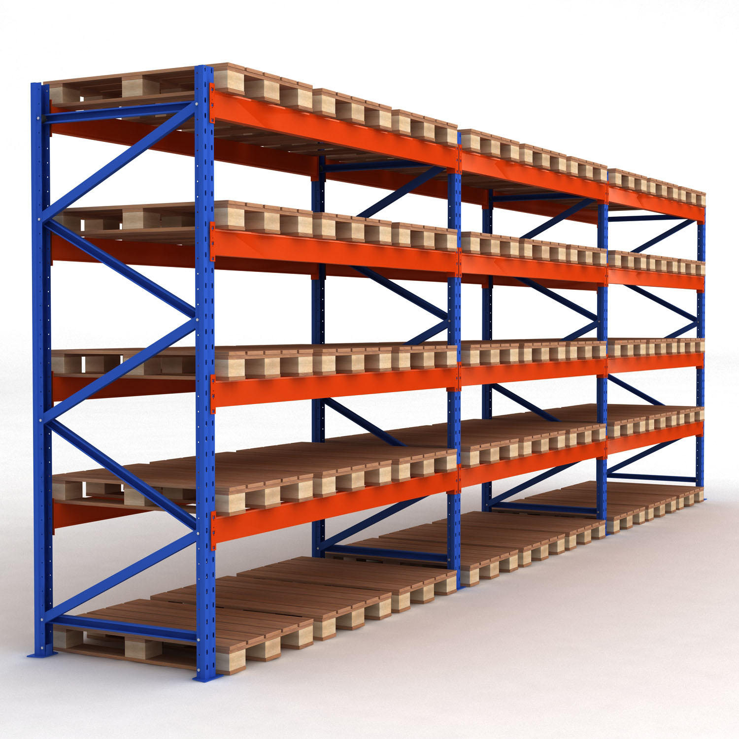 Våra pallställ är tillverkade i kraftigt pullverlackat stål och är designade för att klara av extremt hög belastning. Pallställen har en bärkraft på 3 ton per bärplan och en maxbelastning per pallställ på 8 ton. Detta pallställ består av 3 fack med totalt 45 euro-pallplatser.