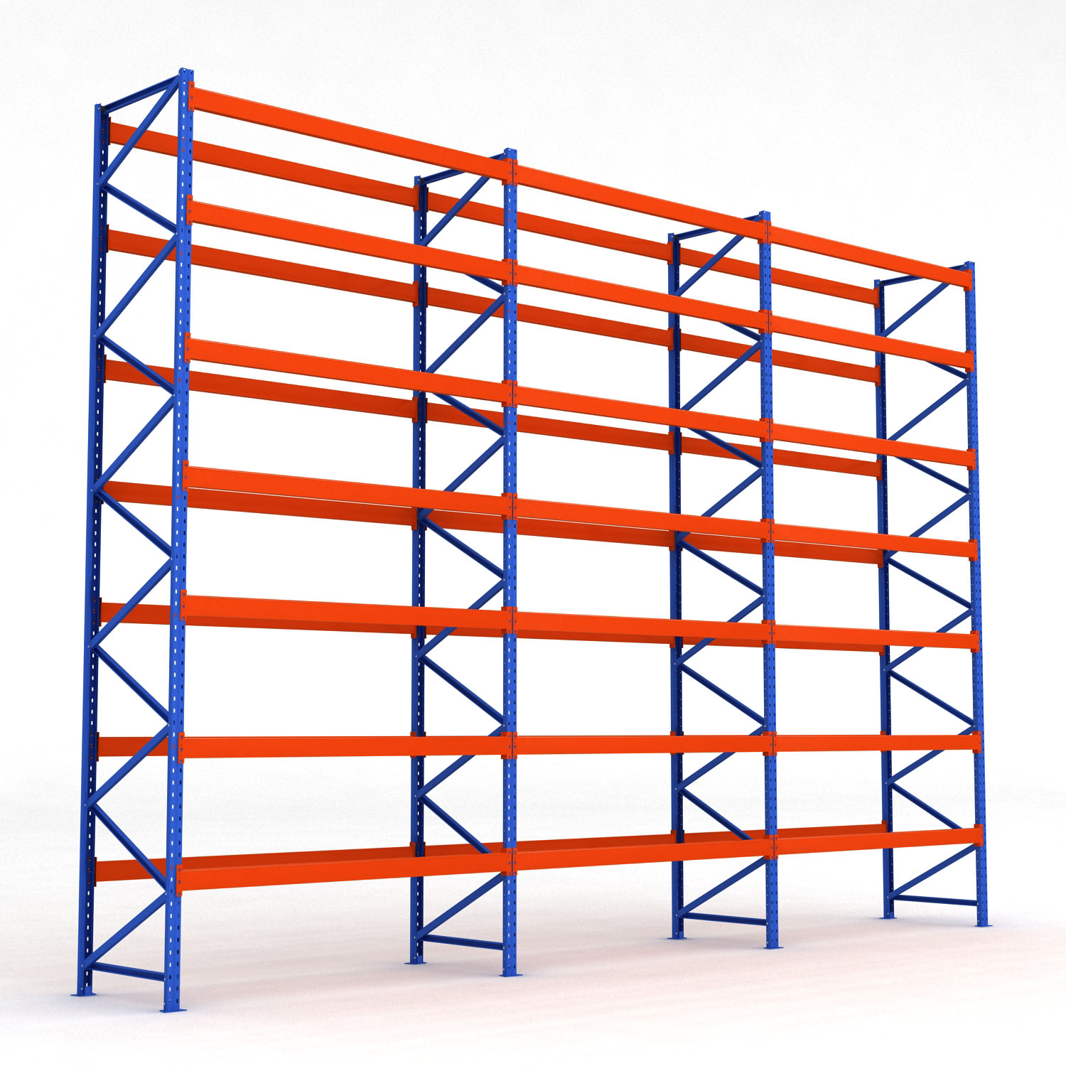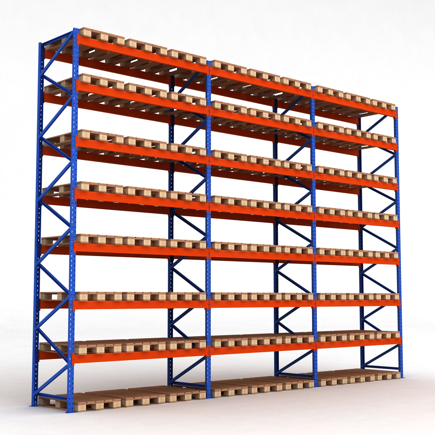 Våra pallställ är tillverkade i kraftigt pullverlackat stål och är designade för att klara av extremt hög belastning. Pallställen har en bärkraft på 3 ton per bärplan och en maxbelastning per pallställ på 20 ton. Detta pallställ består av 3 fack med totalt 72 euro-pallplatser.