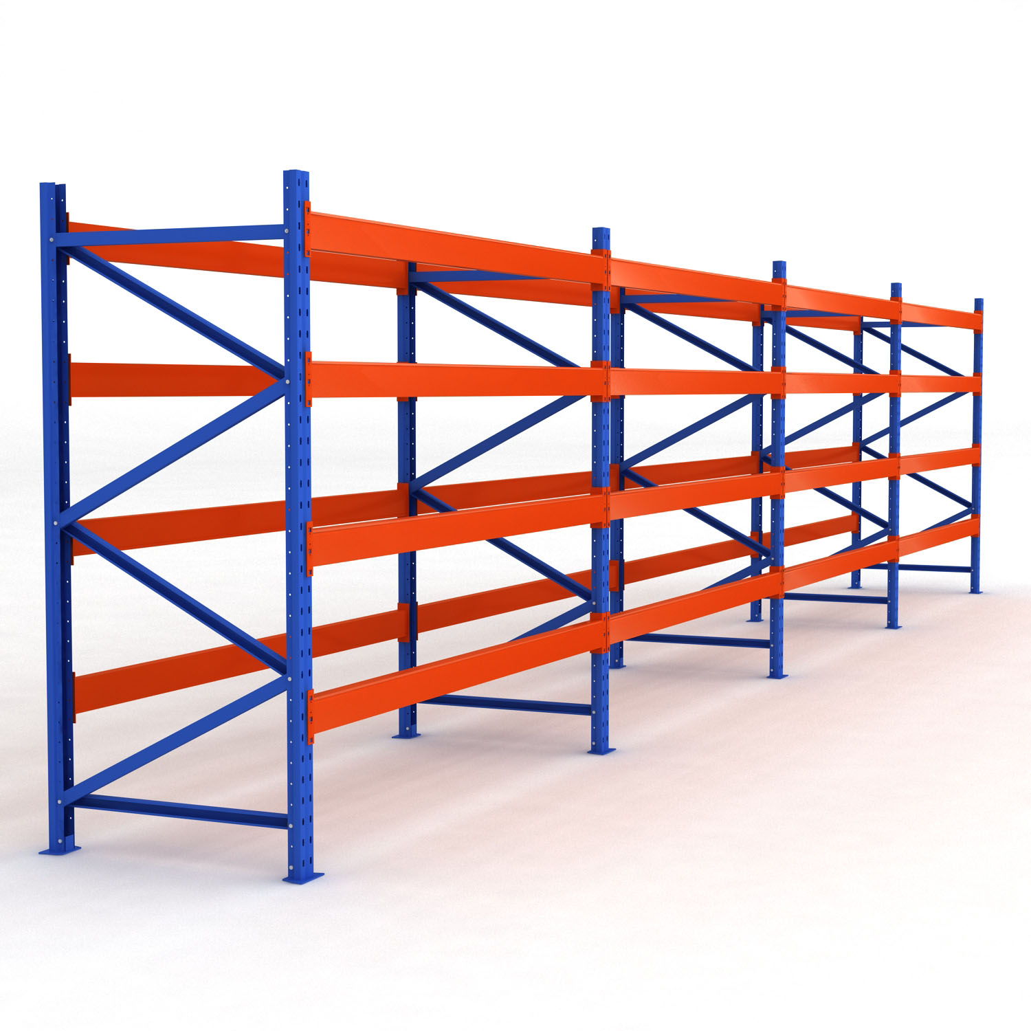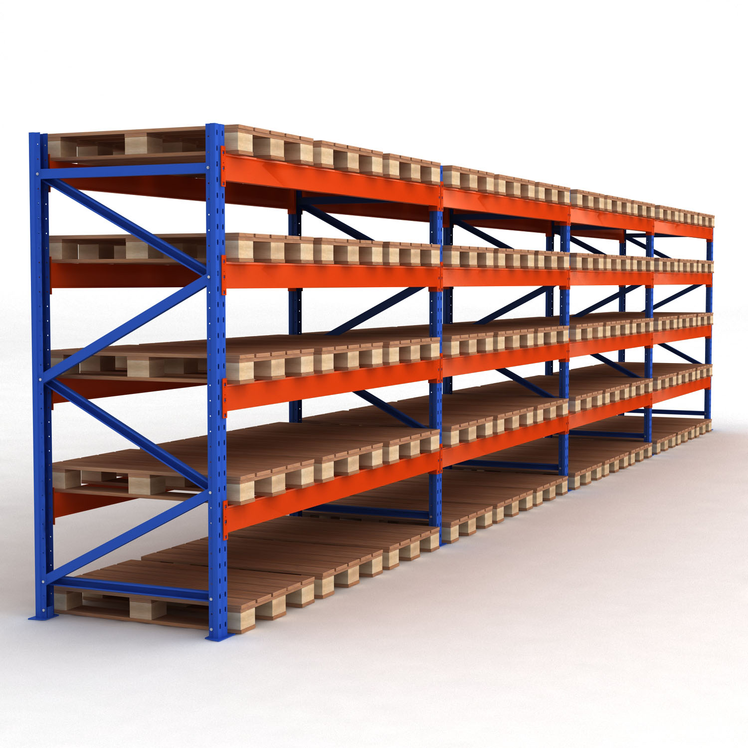 Våra pallställ är tillverkade i kraftigt pullverlackat stål och är designade för att klara av extremt hög belastning. Pallställen har en bärkraft på 3 ton per bärplan och en maxbelastning per pallställ på 8 ton. Detta pallställ består av 4 fack med totalt 60 euro-pallplatser.