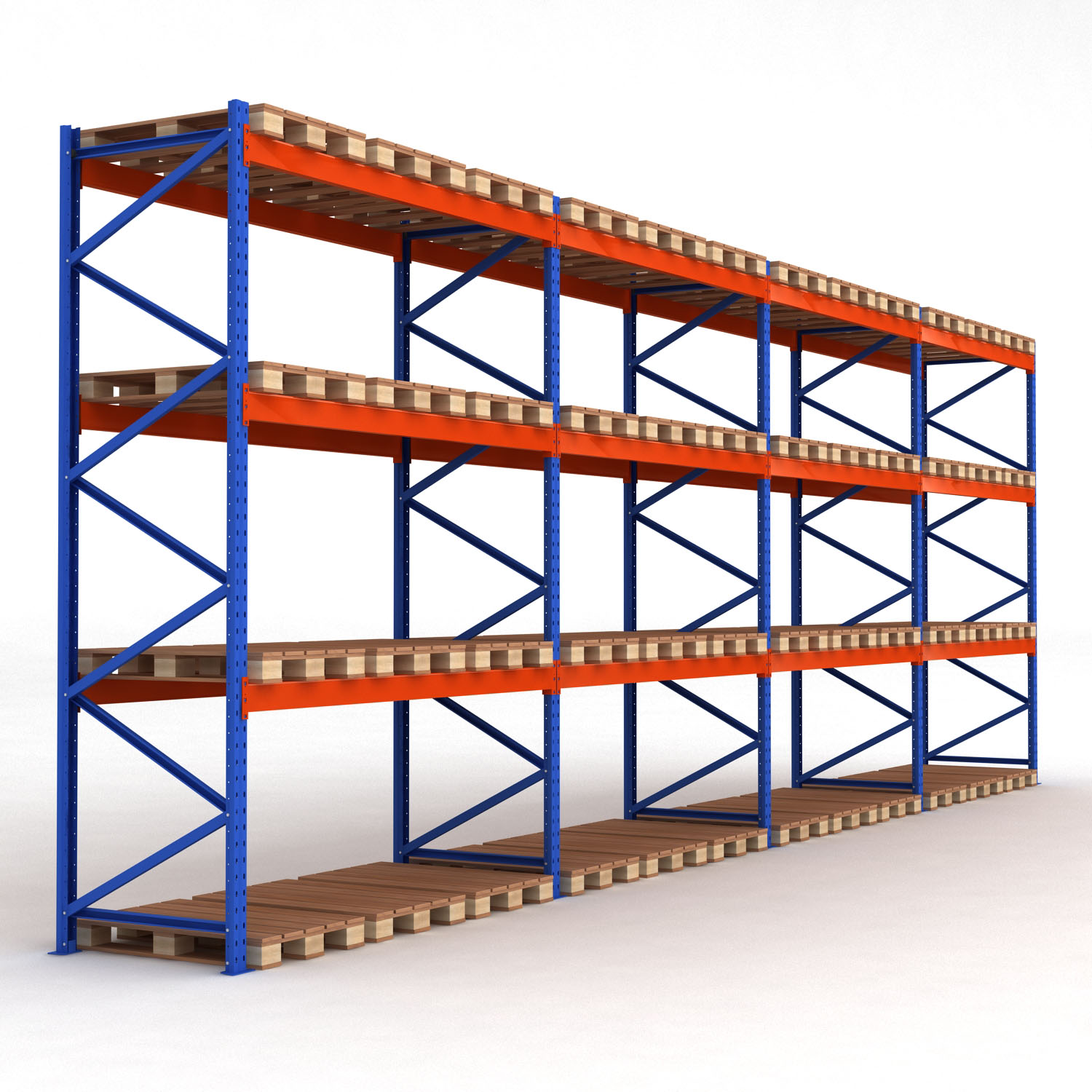 Våra pallställ är tillverkade i kraftigt pullverlackat stål och är designade för att klara av extremt hög belastning. Pallställen har en bärkraft på 3 ton per bärplan och en maxbelastning per pallställ på 13 ton. Detta pallställ består av 4 fack med totalt 48 euro-pallplatser.