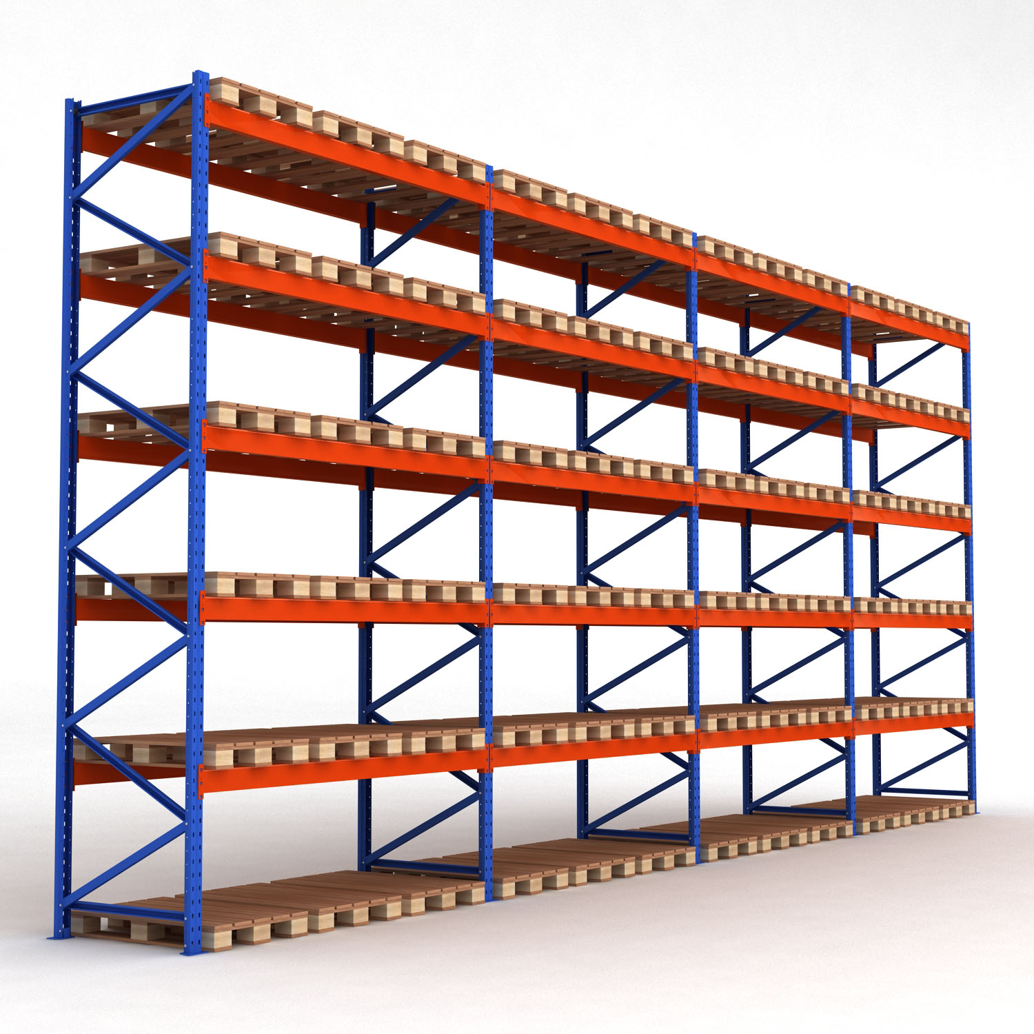 Våra pallställ är tillverkade i kraftigt pullverlackat stål och är designade för att klara av extremt hög belastning. Pallställen har en bärkraft på 3 ton per bärplan och en maxbelastning per pallställ på 16 ton. Detta pallställ består av 4 fack med totalt 72 euro-pallplatser.