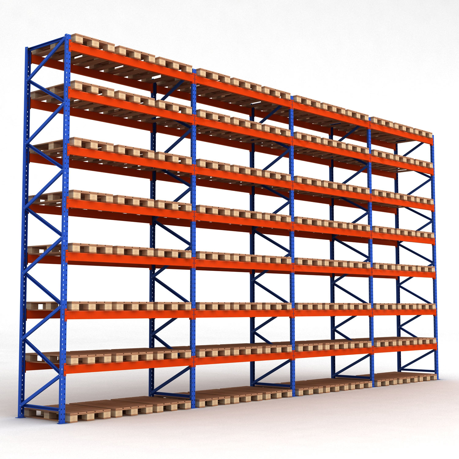 Våra pallställ är tillverkade i kraftigt pullverlackat stål och är designade för att klara av extremt hög belastning. Pallställen har en bärkraft på 3 ton per bärplan och en maxbelastning per pallställ på 20 ton. Detta pallställ består av 4 fack med totalt 96 euro-pallplatser.