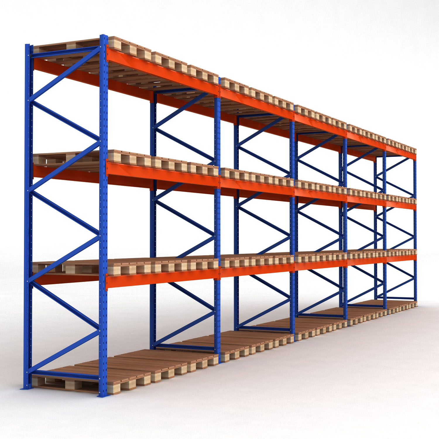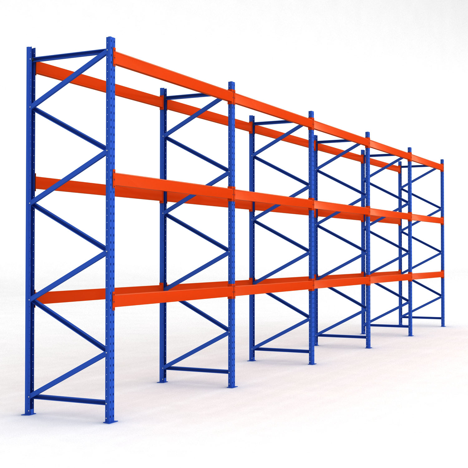 Våra pallställ är tillverkade i kraftigt pullverlackat stål och är designade för att klara av extremt hög belastning. Pallställen har en bärkraft på 3 ton per bärplan och en maxbelastning per pallställ på 13 ton. Detta pallställ består av 5 fack med totalt 60 euro-pallplatser.