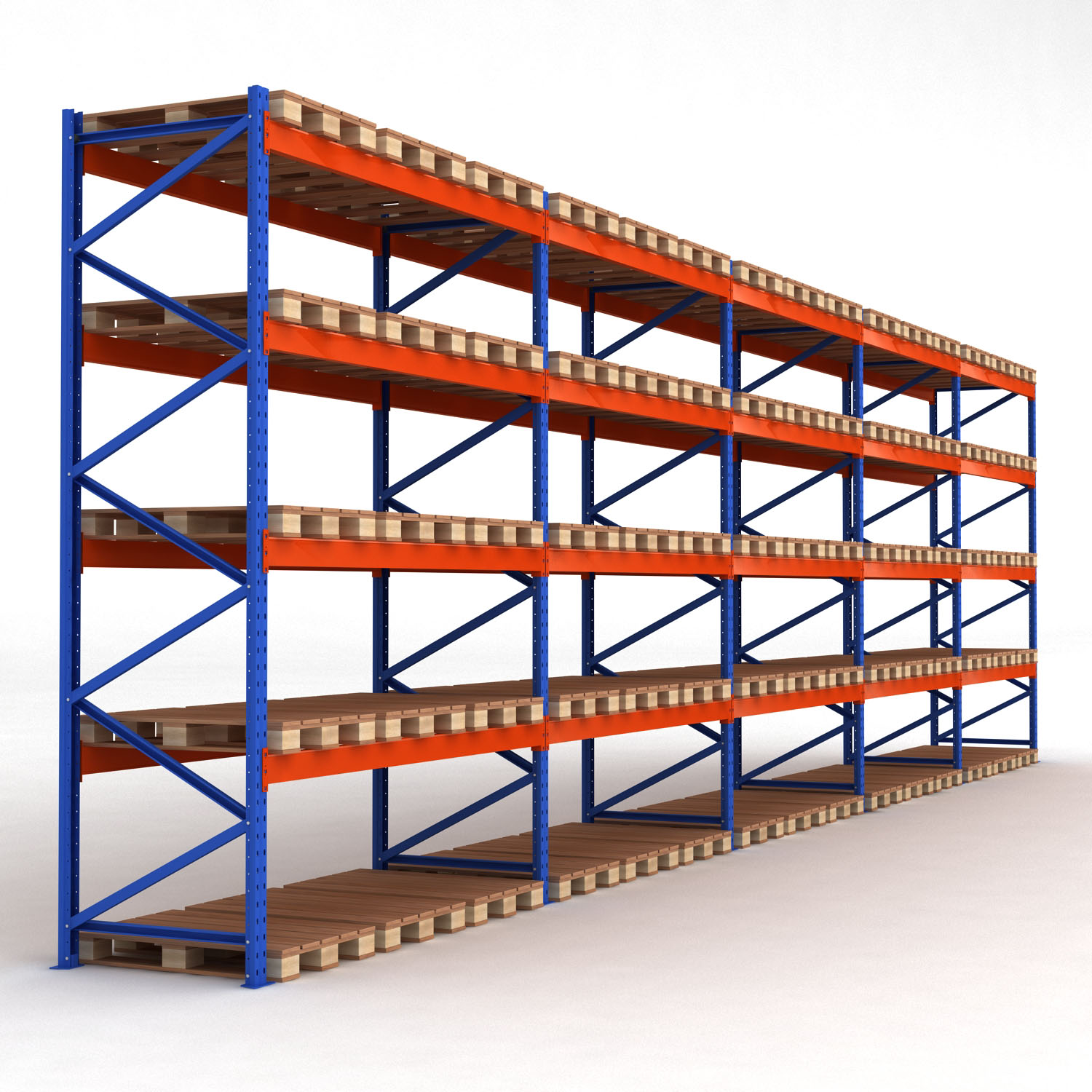 Våra pallställ är tillverkade i kraftigt pullverlackat stål och är designade för att klara av extremt hög belastning. Pallställen har en bärkraft på 3 ton per bärplan och en maxbelastning per pallställ på 13 ton. Detta pallställ består av 5 fack med totalt 75 euro-pallplatser.