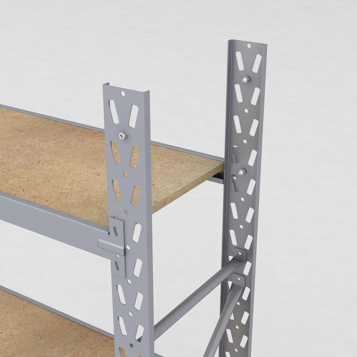 De flyttbara hyllplanen består av spånskivor med en tjocklek på 19 mm. Dessa är särskilt lämpliga för nätbutiker eller plocklager där man önskar minimal rengöring av hyllorna. Dessutom säkrar hyllytan att produkterna har bra grepp och står säkert jämfört med många andra lagerhyllor.